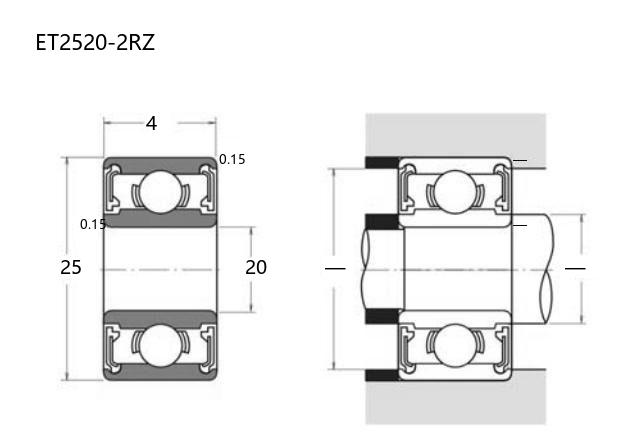 ET2520-2RZ是一款微型深沟球轴承,属于标准微型系列。其结构紧凑,内径为20毫米,外径为25毫米,厚度为4毫米,尺寸设计适用于空间受限的精密场合。该轴承两侧配备接触式密封(2RZ标识),有助于防尘并保留润滑脂,提升运行可靠性。