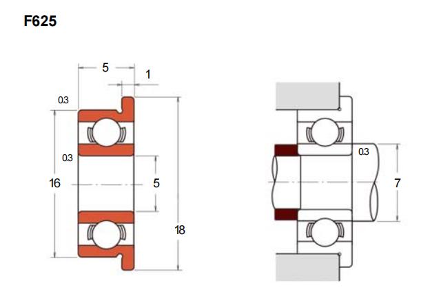 F625属于法兰微型深沟球轴承,其结构采用一侧带法兰的设计,便于安装定位并节省空间。该轴承内径为5mm,外径16mm,厚度5mm,尺寸符合微型轴承的常见规格,适用于轻载荷场景。