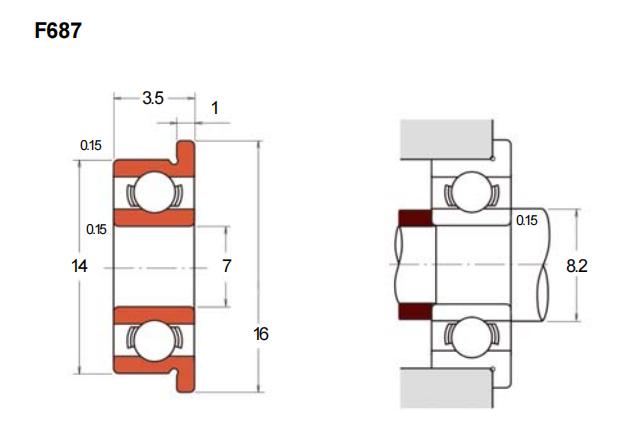 F687是一款微型深沟球轴承,属于带法兰的深沟球轴承类型。其基本尺寸为内径7毫米,外径14毫米,厚度3.5毫米,对应的英制尺寸分别约为0.2756英寸、0.5512英寸和0.1378英寸。这类轴承结构紧凑,法兰设计有助于简化安装和定位,适用于空间受限的精密装置。