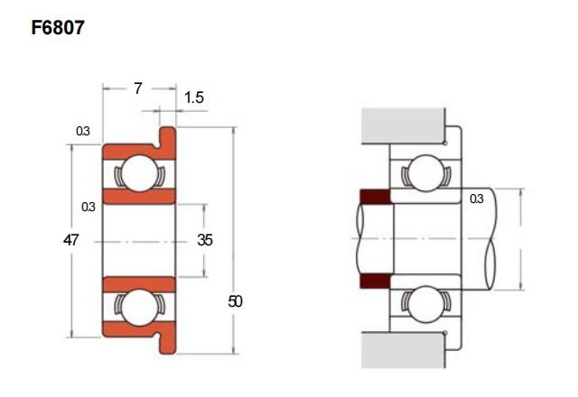 F6807型轴承属于法兰标准型深沟球轴承,其基本尺寸为内径35毫米、外径47毫米、厚度7毫米。这类轴承通常采用冲压外圈结构,具备紧凑的安装尺寸和较轻的重量,适用于空间受限的应用场景。法兰设计使得轴承能够直接通过法兰上的安装孔进行固定,简化了支撑结构的设计与装配流程。