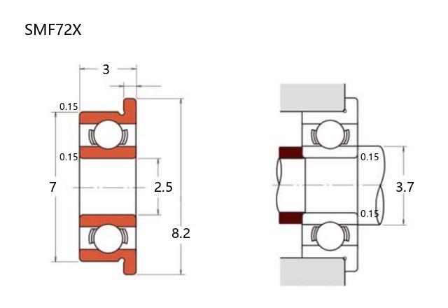 SMF72X型轴承属于深沟球轴承类别下的法兰不锈钢微型系列,其基本尺寸为内径2.5mm、外径7mm、厚度3mm。该轴承采用不锈钢材质,具备一定的耐腐蚀性和耐磨性,适用于潮湿或轻度腐蚀环境。法兰结构设计有助于简化安装定位,并在有限空间内提供径向与轴向支撑。