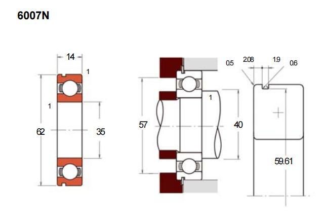 6007N型轴承属于深沟球轴承中的带卡环槽型结构,其内径为35毫米,外径为62毫米,厚度为14毫米。该轴承的设计特点是在外圈上设有卡环槽,可通过卡环实现轴向定位,简化了轴承座的安装结构,适用于对轴向固定有要求的场合。