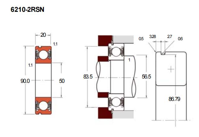 6210-2RSN属于深沟球轴承的一种,具有内径50mm、外径90mm和厚度20mm的标准尺寸规格。该型号轴承在结构上设计有卡环槽,便于安装过程中的轴向定位,常用于需要限制轴承轴向位移的场合。