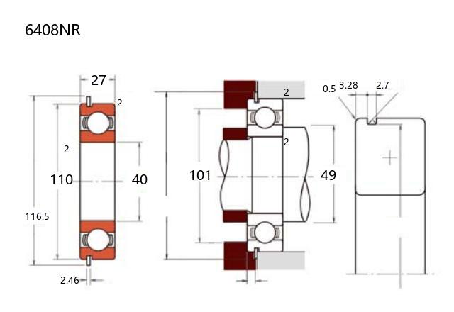 6408NR属于深沟球轴承系列,其内径为40毫米,外径为110毫米,厚度为27毫米。该型号轴承采用带止动槽和卡环的设计,便于轴向定位,简化了安装结构,适用于空间受限或需要简化装配的场合。