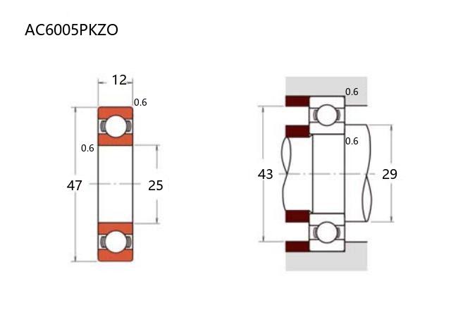 AC6005PKZO轴承是一款采用氧化锆(ZrO₂)陶瓷材料制成的全陶瓷深沟球轴承,其基本尺寸为内径25mm、外径47mm、厚度12mm。该型号属于标准深沟球轴承的一种,具有典型的对称滚道结构和开放式设计,适用于中等转速及一般载荷工况。