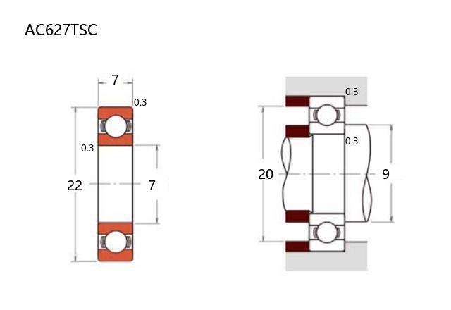 AC627TSC 是一款全陶瓷深沟球轴承,属于标准深沟球轴承类别,具备典型的尺寸规格:内径为 7mm,外径 22mm,厚度 7mm。该型号轴承采用陶瓷材料制造,通常包括氮化硅或氧化锆陶瓷套圈及滚动体,使其具备耐高温、耐腐蚀和非磁性的特性,适用于高速运转或特殊工况。