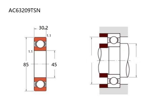 AC63209TSN是一种全陶瓷深沟球轴承,内径为45mm,外径85mm,厚度30.2mm。该轴承采用氮化硅(Si3N4)陶瓷材料制造,具备高硬度、低密度和耐腐蚀等特性,适用于高速运转及高温环境。由于材料本身的自润滑性和绝缘性能,该型号轴承可在润滑条件受限或存在电气干扰的场合中发挥作用。