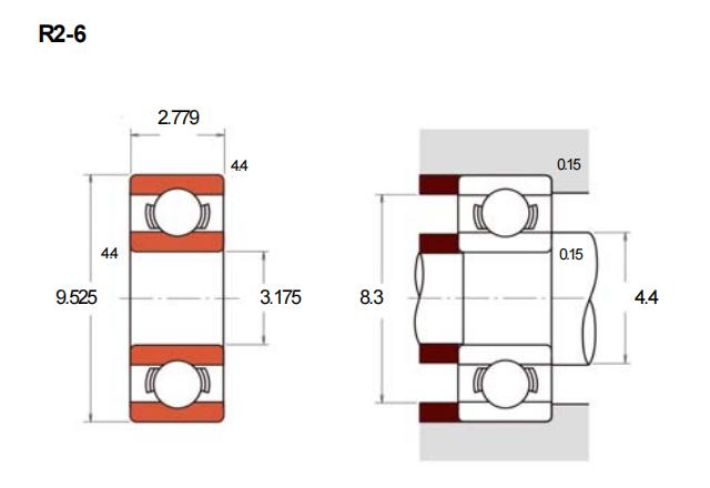 R2-6是一种英制深沟球轴承,属于英制标准型系列。其公称内径为3.175毫米,外径9.525毫米,厚度2.779毫米,对应英制尺寸约为1/8英寸内径、3/8英寸外径和0.109英寸厚度。该轴承采用常见的开放式结构,具备深沟球轴承的基本特性,能够承受一定的径向载荷和双向轴向载荷。