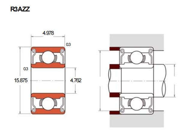 R3AZZ轴承属于英制深沟球轴承中的标准型产品,其内径为4.762毫米,外径为15.875毫米,厚度为4.978毫米。这类轴承通常采用金属防尘盖结构,具有一定的密封性能,可帮助减少外部污染物侵入并延缓润滑脂流失。由于尺寸较小且结构紧凑,该型号适用于较高转速及轻载至中载的应用场景,常见于小型机械、仪器设备或精密传动部件中。