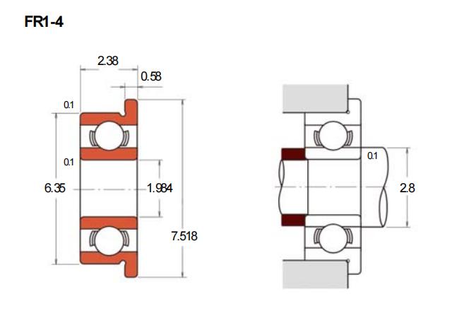 FR1-4属于英制深沟球轴承系列中的法兰型产品,其结构设计便于安装定位,适用于空间紧凑且需轴向固定的场合。该轴承内径约为1.984mm,外径6.35mm,厚度2.38mm,尺寸符合英制标准。法兰结构可提供额外的径向支撑,有助于简化装配流程。