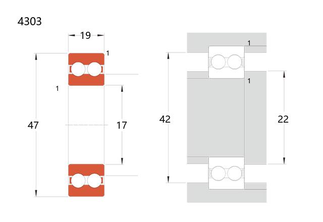 4303型轴承属于双列深沟球轴承,隶属于4200/4300系列。其内径为17mm,外径为47mm,厚度为19mm,尺寸规格适用于中等负载应用场景。双列结构设计提供了相对较高的径向承载能力,并具备一定的双向轴向负荷承受性能。
