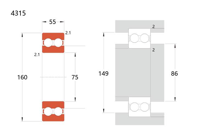 4315型轴承属于双列深沟球轴承,是4200/4300系列中的一种常见型号。其基本尺寸为内径75毫米、外径160毫米、厚度55毫米。该结构设计提供了较好的径向承载能力,并具备一定的双向轴向负荷承受性能。由于采用双列滚道布局,其刚性较单列轴承有所增强,适用于中等转速及复合载荷工况。