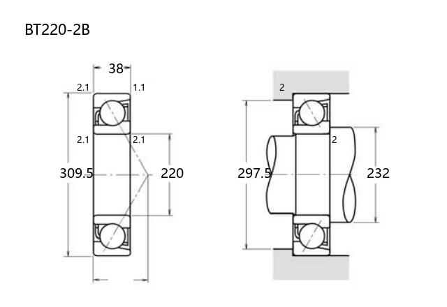 BT220-2B型轴承属于角接触球轴承,其内径为220mm,外径为309.5mm,厚度为38mm。该型号轴承可承受径向和轴向联合载荷,适用于转速较高、同时存在双向轴向负荷的工况。由于接触角的设计,这类轴承在支撑刚性方面具有一定优势,常见于中等载荷及精度要求的设备中。