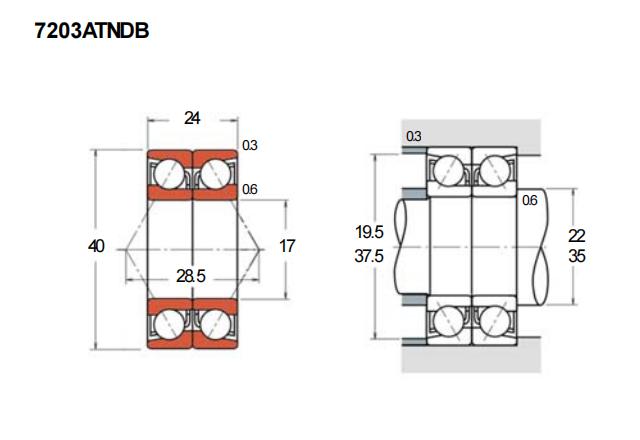 后缀列表:【A:接触角 30°】【TN:聚酰胺树脂(尼龙)保持架】【DB:双列背靠背(<>)配对】