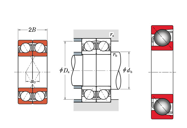后缀列表:【B:接触角 40°】【W:钢板冲压冠形保持架】【DF:双列面对面(\ /)配对】