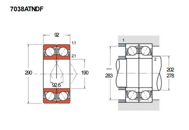 7038ATNDF角接触球轴承的内径为190毫米,外径为290毫米,厚度为92毫米。该轴承采用DF配对方式,属于精密角接触球轴承的一种配置形式。这种配对设计使轴承能够承受双向的轴向载荷以及径向载荷,同时具备较好的刚性。
