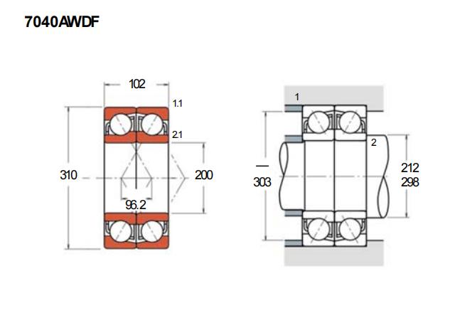 7040AWDF是一款角接触球轴承,其基本尺寸为内径200mm、外径310mm、厚度102mm。该轴承属于精密配对角接触球轴承系列,采用DF(面对面)配对方式,预置了特定的载荷和游隙,使其能够同时承受径向和轴向的联合载荷,尤其适用于需要较高刚性和运行精度的工况。