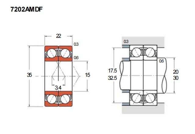 7202AMDF是一款角接触球轴承,其基本尺寸为内径15毫米、外径35毫米、厚度22毫米。该型号后缀“AMDF”表明其为两个单列角接触球轴承以特定的DF方式配对组合而成,这种配对形式意味着两套轴承在安装时呈背对背配置。