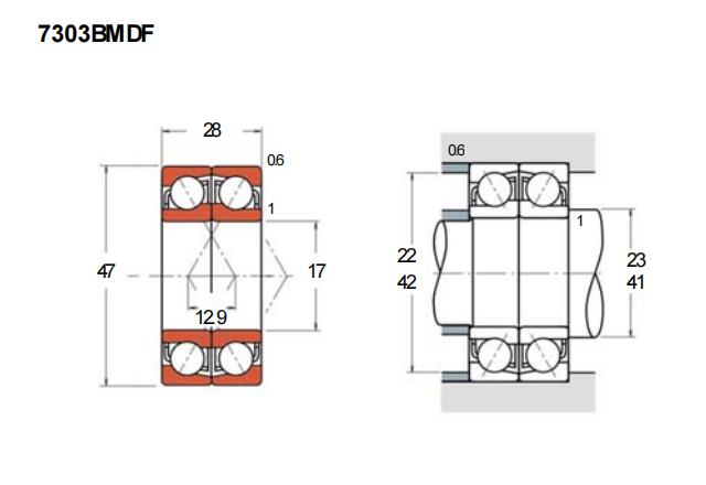 角接触球轴承能够同时承受径向载荷和轴向载荷,其接触角设计使得轴承在高速运转时具有较好的稳定性。7303BMDF的DF配对形式通常指两套轴承以“背对背”方式安装,这种布局有助于提升轴承组的刚性,并能够承受作用于两个方向的轴向载荷。这种特性使其适用于对旋转精度和运行稳定性有一定要求的场合,例如在一些传动系统或精密部件中可能被考虑使用。