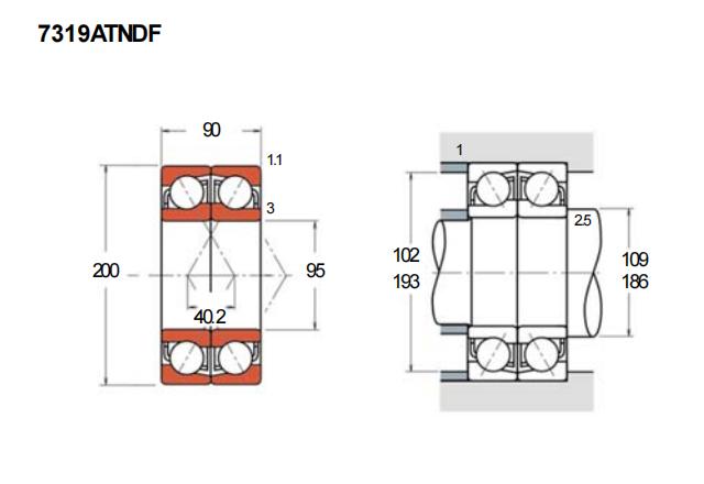 7319ATNDF角接触球轴承属于精密配对组合轴承中的DF配置形式。该型号基本尺寸设计为内径95毫米、外径200毫米、厚度90毫米,整体结构紧凑且承载布局均衡。其接触角设计使轴承能够同时承受径向载荷和轴向载荷,在双向轴向负载场合表现出良好的刚性。