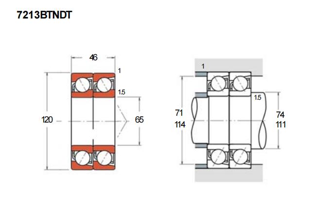 7213BTNDT 型号轴承是一款角接触球轴承,其基本尺寸为内径65毫米、外径120毫米、厚度46毫米。该轴承采用两套单体角接触球轴承以DT方式配对,形成能够承受双向轴向负荷的刚性支承单元。