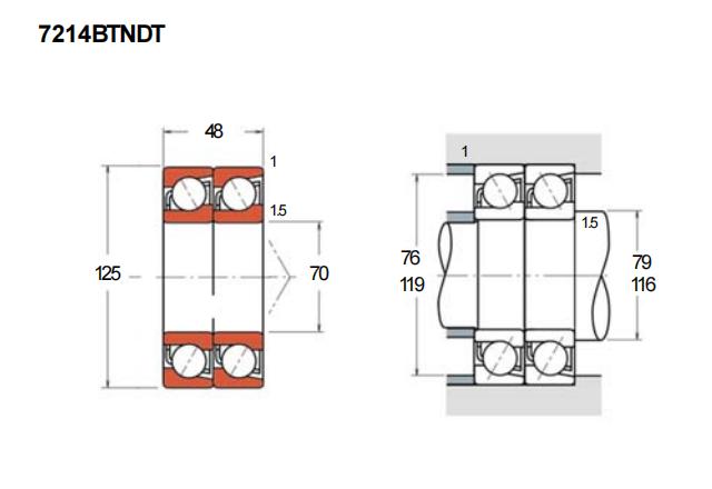 在结构上,该轴承设计用于同时承受径向和轴向联合载荷,接触角的存在使其轴向承载能力相对较高。DT配对形式是指两套相同的角接触球轴承以背对背方式配组,这种配置有助于提高轴承组的刚性,并能在运行中承受倾覆力矩,适用于对支承系统稳定性有一定要求的场合。