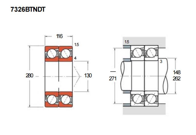 7326BTNDT属于角接触球轴承的一种特定配置,其基本尺寸为内径130毫米、外径280毫米、厚度116毫米。该轴承采用DT配对方式,即两套单列角接触球轴承以背对背形式组合,这种结构能够同时承受径向负荷与双向的轴向负荷,并具备较好的刚性。