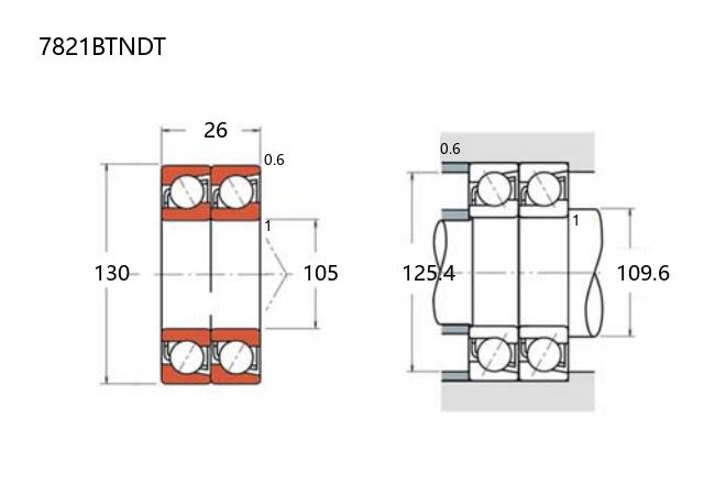 7821BTNDT轴承属于角接触球轴承系列,其基本尺寸为内径105毫米,外径130毫米,厚度26毫米。该型号后缀“DT”代表轴承采用两套单体以背对背形式配对提供,这种配置能够同时承受径向负荷与双向轴向负荷,并具备一定的倾覆力矩抵抗能力。