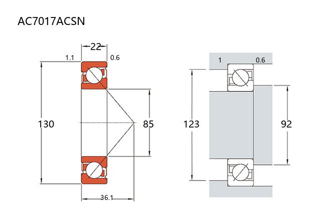 AC7017ACSN 是一种角接触球轴承,其结构为AC7000全陶瓷型设计。该型号轴承的基本尺寸为内径85毫米、外径130毫米、厚度22毫米,属于紧凑型部件。其内外圈及滚动体均采用氮化硅陶瓷材料制造,具有较高的硬度和耐磨损特性。