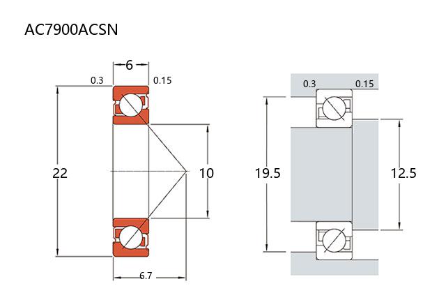 AC7900ACSN型轴承属于AC7000系列全陶瓷角接触球轴承,其基本尺寸为内径10毫米、外径22毫米、厚度6毫米。该轴承的滚动体与内外圈均采用氮化硅陶瓷材料制造,具备轻量化、高刚性、低热膨胀系数以及优异的电绝缘性能。在高速运转条件下,氮化硅材质可有效降低离心力影响,减少温升,并表现出良好的耐磨特性。