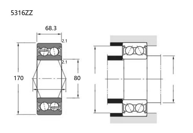 此类轴承通常采用两侧带防尘盖(ZZ后缀)的结构,有助于在装配前保持内部润滑脂并减少外部污染物侵入,适用于对防尘有一定要求的工作环境。由于其结构特点和性能,5316ZZ常见于中型工业设备中,例如传动系统、电机、齿轮箱等需要承受联合负荷且要求结构紧凑的场合。