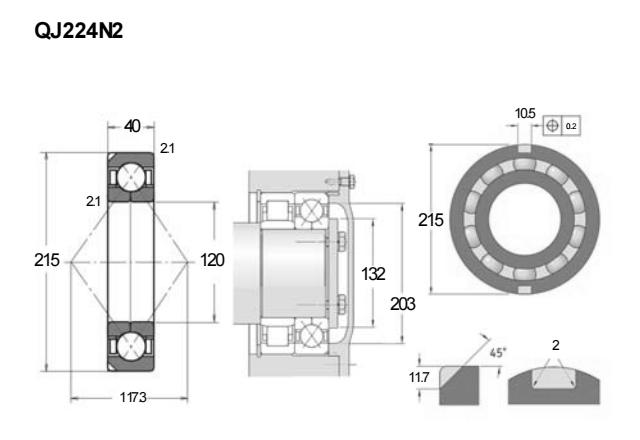 QJ224N2 是一款四点角接触球轴承,其基本尺寸为内径 120mm、外径 215mm、厚度 40mm,属于结构较为紧凑的类型。该轴承在外圈上设计有键槽,便于进行周向固定和安装过程中的定位,有助于简化轴向定位结构。此类轴承可以同时承受径向载荷和双向轴向载荷,由于沟道经过特殊优化,单个轴承能起到类似背对背配对轴承的作用,适用于需要较高刚性和运转精度的场合。