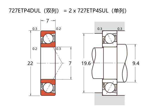 727ETP4DU型轴承属于超高精密角接触球轴承中的标准型结构,其内径、外径和厚度分别为7毫米、22毫米和14毫米。该轴承采用接触角设计,能够同时承受径向载荷和轴向载荷,尤其适用于需要高刚性和精确旋转精度的场合。