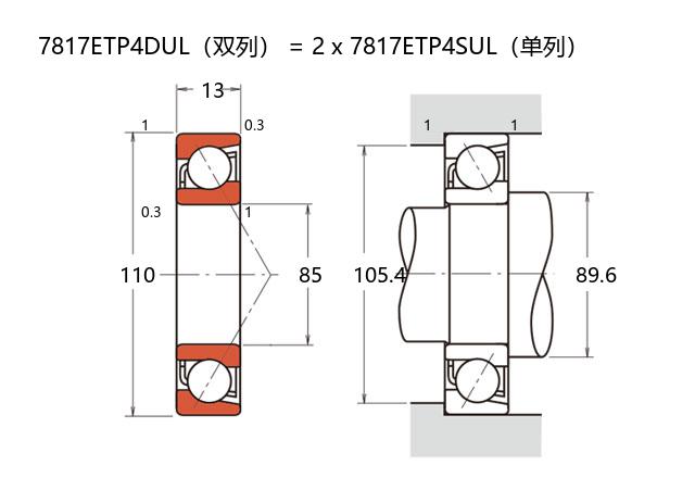 后缀列表:【E:25° 接触角】【T:树脂保持架】【P4:P4 级精度】【DU:双列万能配对】