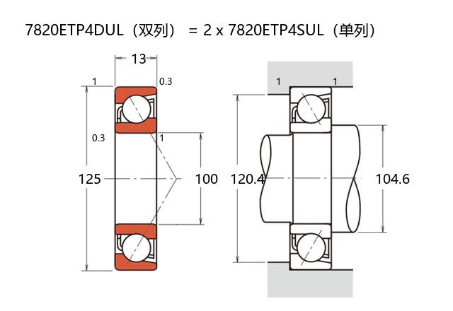 7820ETP4DU是一款标准型精密角接触球轴承,其基本尺寸为内径100毫米、外径125毫米、厚度26毫米。该轴承归类于超高精密轴承系列,设计用于支撑复合载荷,即在承受径向负荷的同时,也能承受一定的轴向负荷。