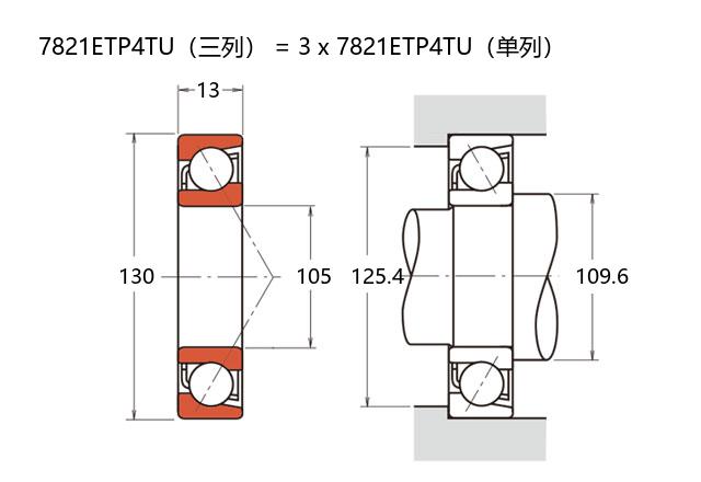 后缀列表:【E:接触角 25°】【T:聚酰胺尼龙保持架】【P4:ISO 4级精度】【TU:三列万能配对】