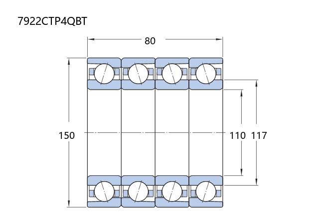 后缀列表:【C:15° 接触角】【T:聚酰胺尼龙保持架】【P4:ISO 4级精度】【QBT:四列背靠背串联串联(<>>>)配对】