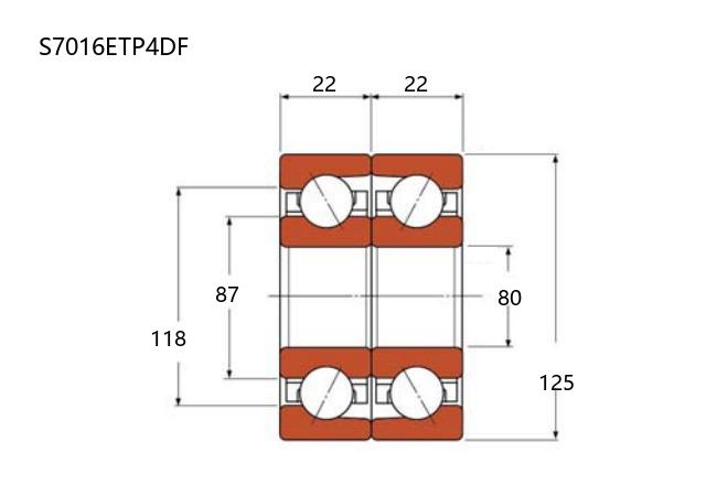 前缀列表:【S:标准密封型】后缀列表:【E:25° 接触角】【T:聚酰胺保持架】【P4:P4 级精度】【DF:双列面对面(\ /)配对】