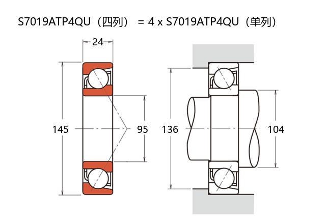前缀列表:【S:标准密封型】后缀列表:【A:接触角 30°】【T:聚酰胺保持架】【P4:P4 级精度】【QU:四个万能组合】