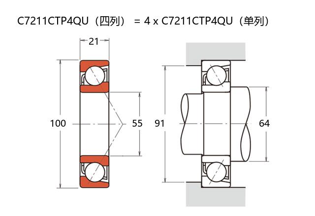 前缀列表:【C:标准陶瓷球型】后缀列表:【C:接触角 15°】【T:聚酰胺尼龙保持架】【P4:P4 级精度】【QU:四列万能配对】