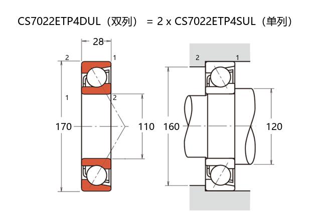 前缀列表:【C:陶瓷球】【S:密封型】后缀列表:【E:接触角 25°】【T:尼龙保持架】【P4:ISO 4级精度】【DU:两个万能组合】