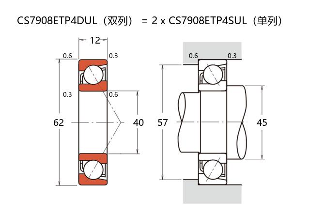 前缀列表:【C:陶瓷球】【S:密封型】后缀列表:【E:接触角 25°】【T:尼龙保持架】【P4:ISO 4级精度】【DU:两个万能组合】