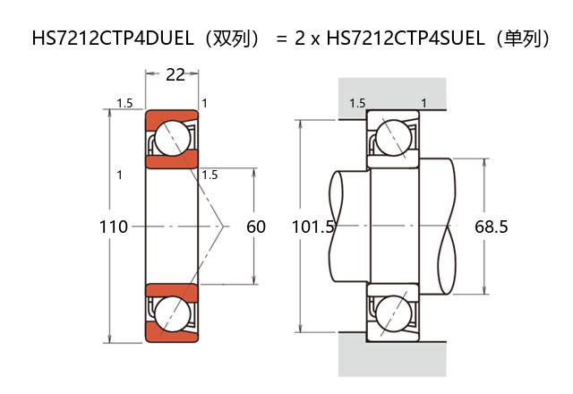 前缀列表:【H:高转速】【S:小球型】后缀列表:【C:15° 接触角】【T:聚酰胺尼龙保持架】【P4:P4 级精度】【DU:两个万能组合】