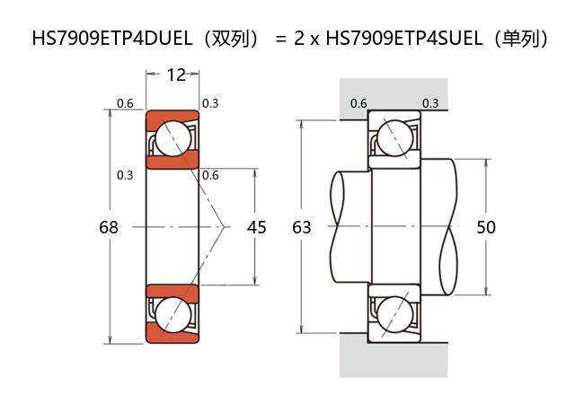 前缀列表:【H:高转速】【S:小球型】后缀列表:【E:接触角 25°】【T:聚酰胺尼龙保持架】【P4:P4 级精度】【DU:两个万能组合】