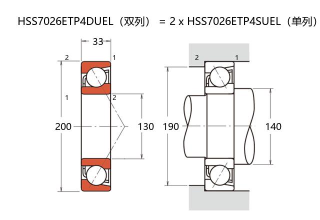 前缀列表:【H:高转速】【S:小球】【S:密封型】后缀列表:【E:接触角 25°】【T:聚酰胺保持架】【P4:P4 级精度】【DU:两个万能组合】