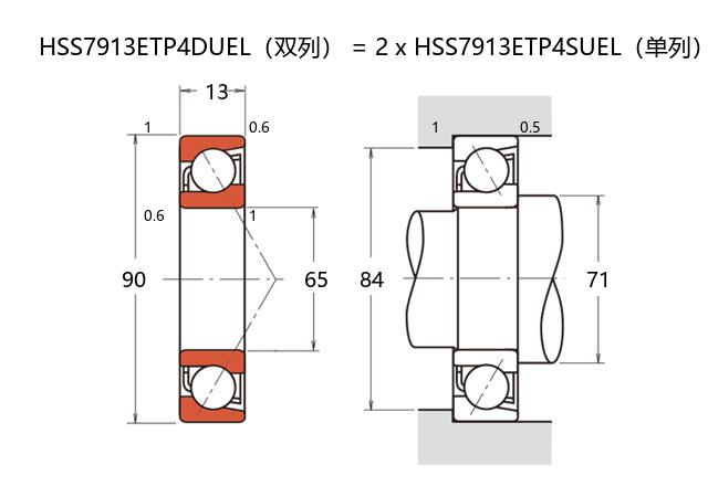 前缀列表:【H:高转速】【S:小球】【S:密封型】后缀列表:【E:接触角 25°】【T:聚酰胺保持架】【P4:P4 级精度】【DU:两个万能组合】