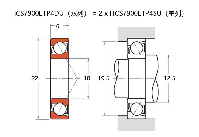 前缀列表:【H:高转速】【C:陶瓷球】【S:密封型】后缀列表:【E:接触角 25°】【T:尼龙保持架】【P4:P4 级精度】【DU:双列万能配对】