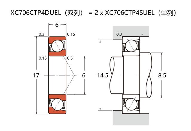 前缀列表:【X:超高转速】【C:陶瓷球型】后缀列表:【C:接触角 15°】【T:聚酰胺尼龙保持架】【P4:P4 级精度】【DU:两个万能组合】
