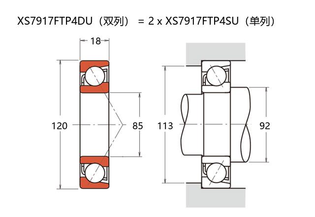 前缀列表:【X:超高转速】【S:小球型】后缀列表:【F:接触角 18°】【T:聚酰胺尼龙保持架】【P4:P4 级精度】【DU:双列万能配对】