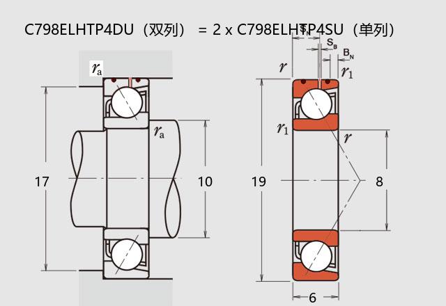 前缀列表:【C:标准陶瓷球型】后缀列表:【E:接触角 25°】【LH:带润滑孔】【T:聚酰胺保持架】【P4:P4 级精度】【DU:双列万能配对】